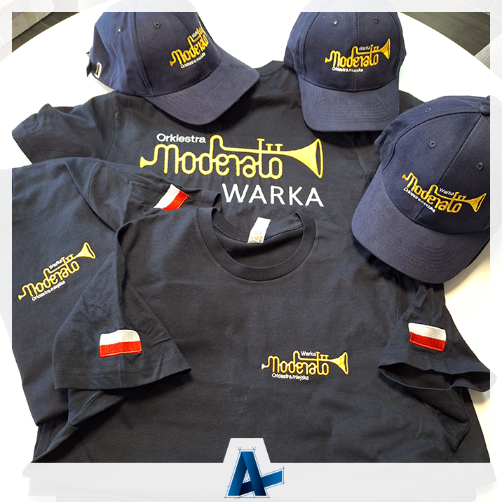 Koszulki i czapki z haftowanym logo wykonane dla Miejskiej Orkiestry Moderato w Warce 👌😊